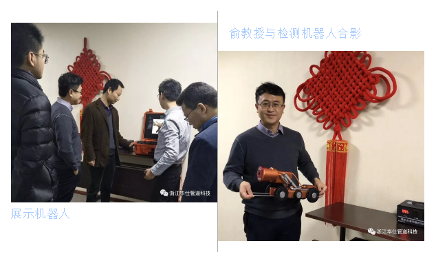 我司展示了自主研发的管道检测机器人,俞教授对机器人的改进和创新提出了宝贵意见并与我司领导人就城市管道机器人的前沿科技及发展方向等课题进行了深入的探讨。